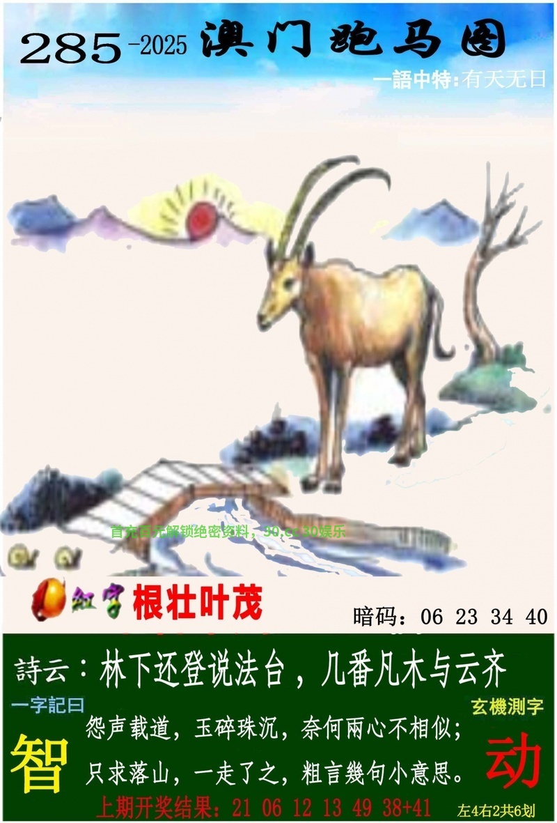 288期一字記曰:【浮】 日出半輪,烏儿雙雙,彩運于冉冉揚揚;島儿對頭,魚对雨尾,旺氣有神神奇奇。【淏】 解:日出半輪,烏儿雙雙,彩運于冉冉揚揚;胆小:鼠蛇龙羊鸡兔 解肖:鼠蛇龙羊鸡兔 |