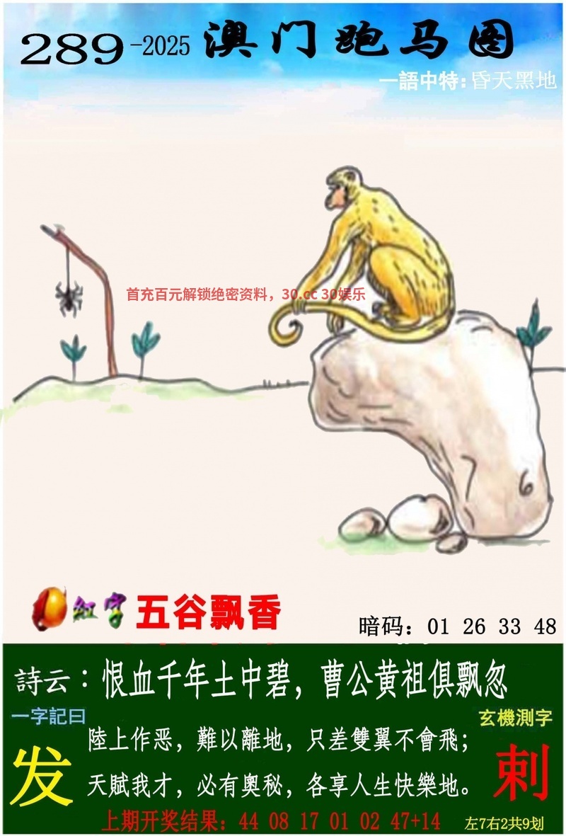 289期一字記曰:【发】 陸上作恶,難以離地,只差雙翼不會飛;天賦我才,必有奥秘,各享人生快樂地。【刺】 解:陸上作恶,難以離地,只差雙翼不會飛;白肖:鼠虎牛鸡狗猪 解肖:鼠虎牛鸡狗猪 |